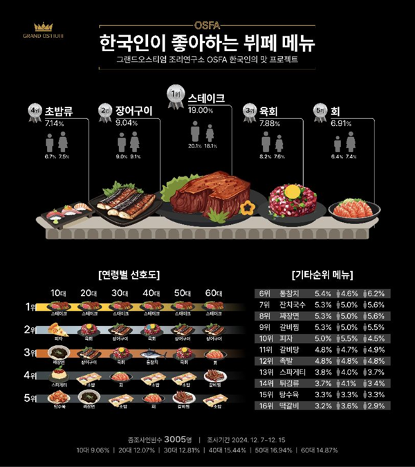 한국인이 가장 좋아하는 뷔페 메뉴는 무엇일까? 서비스벤처기업 오스티엄(대표이사 전하영)이 운영하는 인천웨딩홀 그랜드오스티엄과 콜라보마이스켄벤센터(CMCC)에서는 지난 12월 7일부터 12월 15일까지 연령별 10대에서 60대에 이르는 3,005명의 고객을 대상으로 ‘한국인이 가장 좋아하는 뷔페메뉴’ 설문조사를 실시하였다.